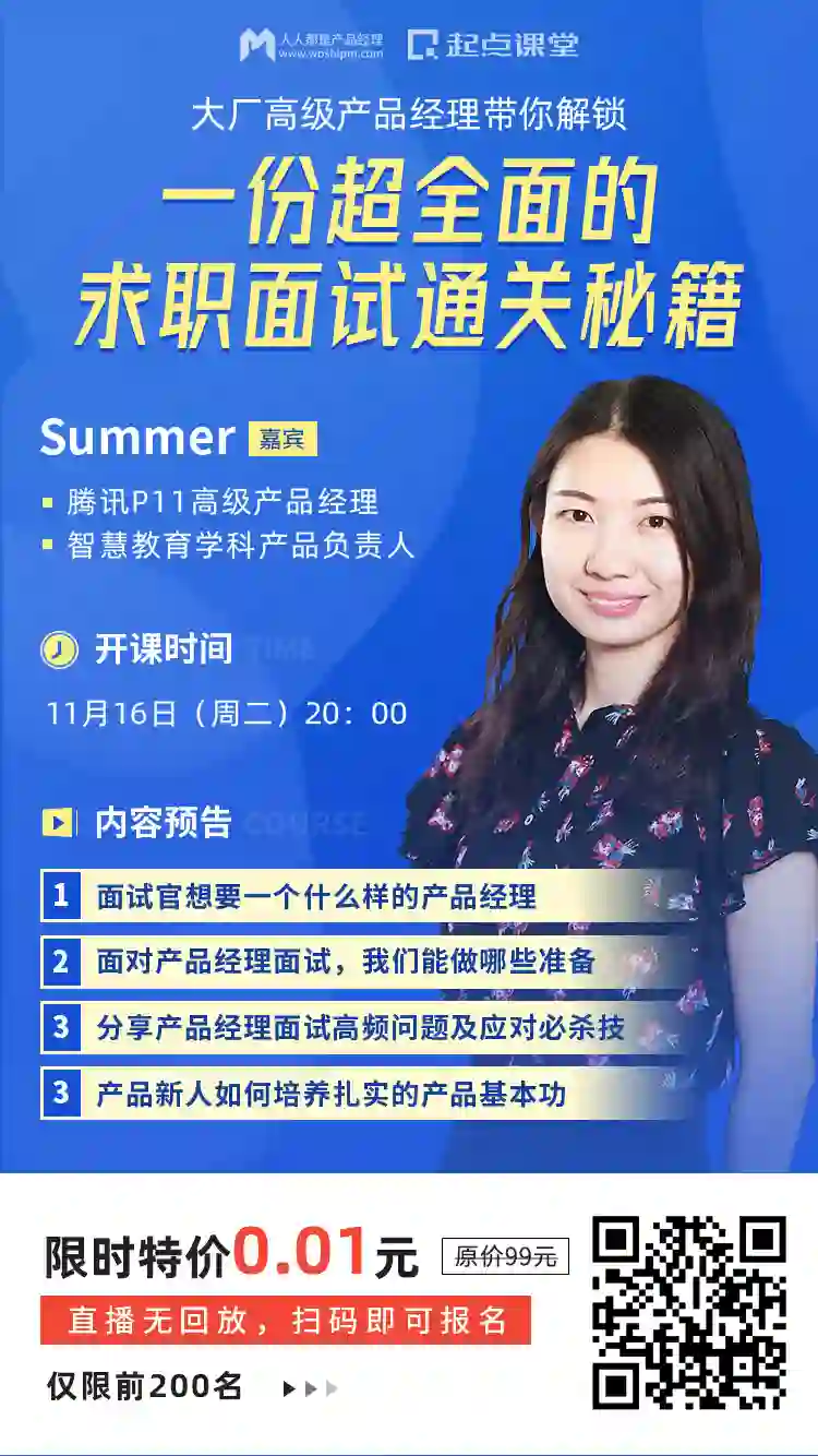 为了帮助零经验应届生、转岗/转行、产品新人们能更顺利地应对面试,提升面试的通过率,我们特别邀请了腾讯P11高级产品经理@Summer来为大家在线1小时拆解用人单位要求,剖析产品经理面试高频问题及应对必杀技,总结答题方法论。