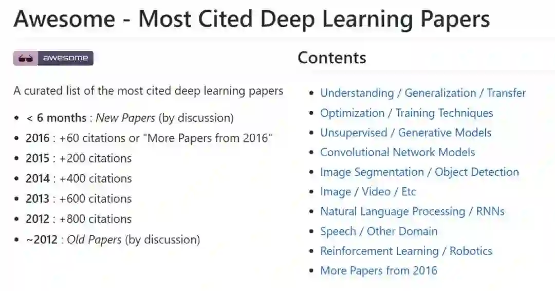 这是来自于terryum整理的一份自2012年起被引用最多数量的深度学习论文列表