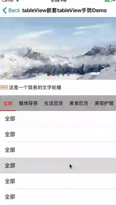 可以看到最上面是一块轮播图组件,我也已经整理了一份轮播图组件在github上面,轮播图下面还有若干条其他的内容,而且这几块内容都是后台动态控制显示的,所以这里用UIScrollView设置顶部偏移量实现是很不方便的。最外层我肯定选择使用tableView分区管理来实现。而下面的横向分类页面肯定需要tableView去实现