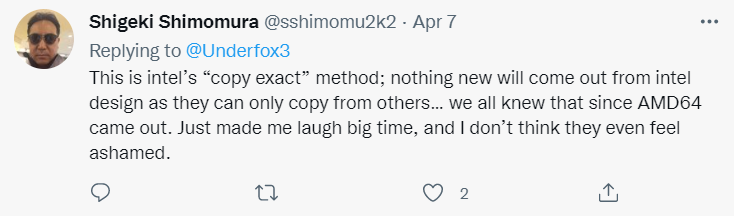 Shimomura表示,「这就是英特尔的照抄法。他们没新东西,只会抄袭。AMD64出来的时候我们就知道这一点了。这次只是又让我能笑话英特尔一次。他们估计都不会有任何羞愧心。」
