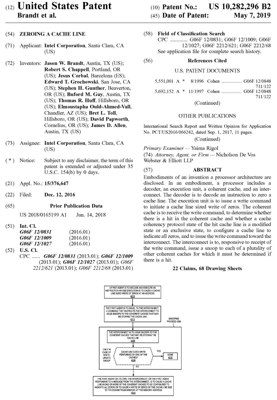 2019年5月,一个名为「缓存行清零」(zeroing a cache line)的专利得到通过,其内容可谓是和这次的「用于处理器架构的设备和方法」(apparatuses and methods for a processor architecture)一模一样。