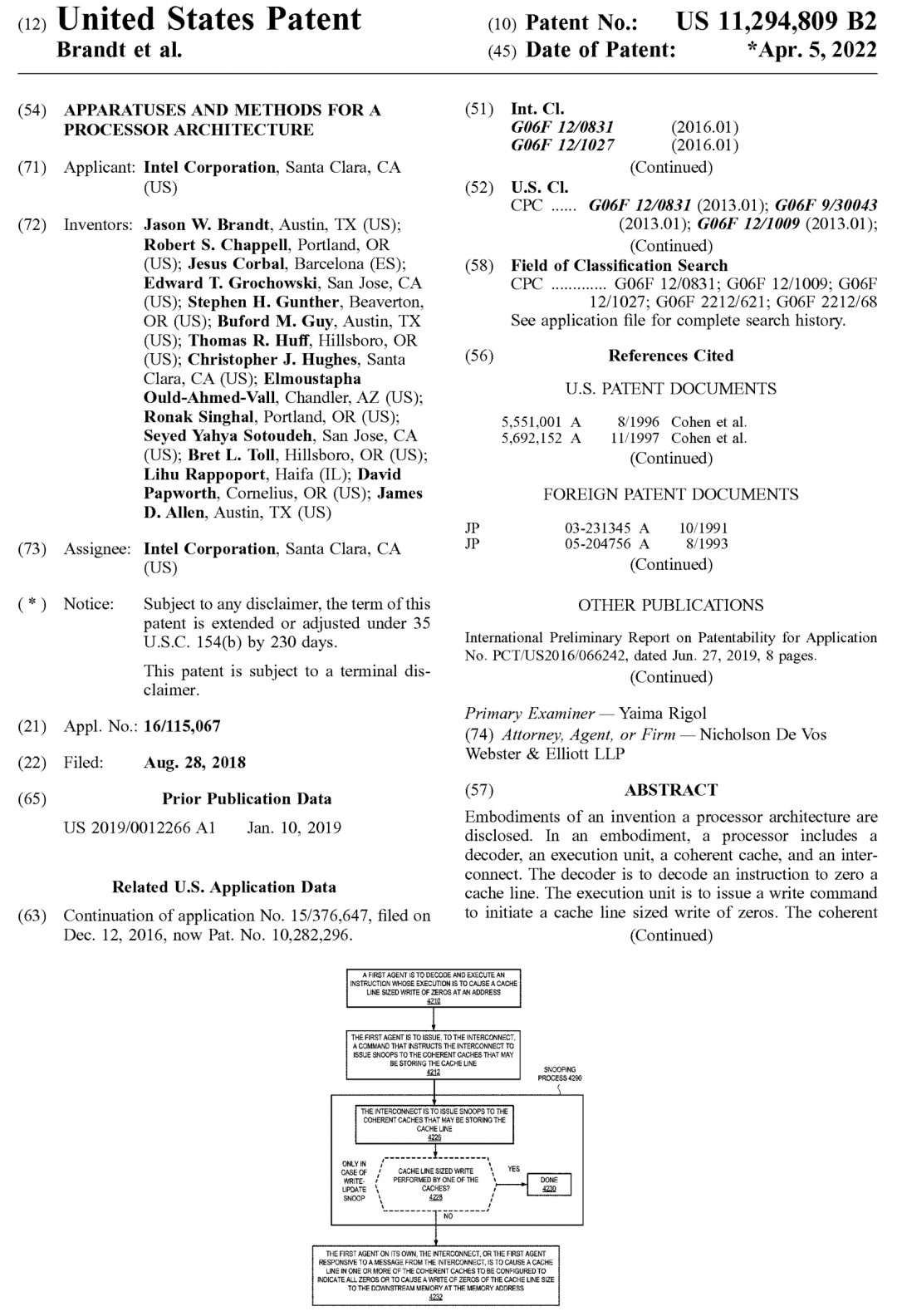今天的另一位主角,也就是英特尔编号为US 11,294,809 B2的专利,于2022年4月5日得到通过。