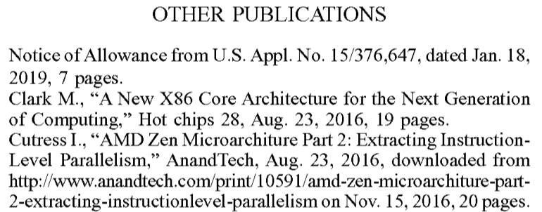 这个说法倒是可以在专利的引用部分得到佐证,其中就包括了2016年8月AMD在HotChips上有关Zen架构的演讲PPT。