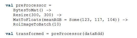 这个样例的预处理流水线将一个原始RDD通过一系列的转换,转成一个Batch的RDD。其中,ByteToMat把Byte图片转换成OpenCV的Mat存储格式,Resize将图片的调整为300x300的大小,MatToFloats将Mat里的像素存成Float数组的格式,并减去对应通道的均值。最后,RoiImageToBatch把数据组成Batch,作为模型的输入,用于预测或训练。