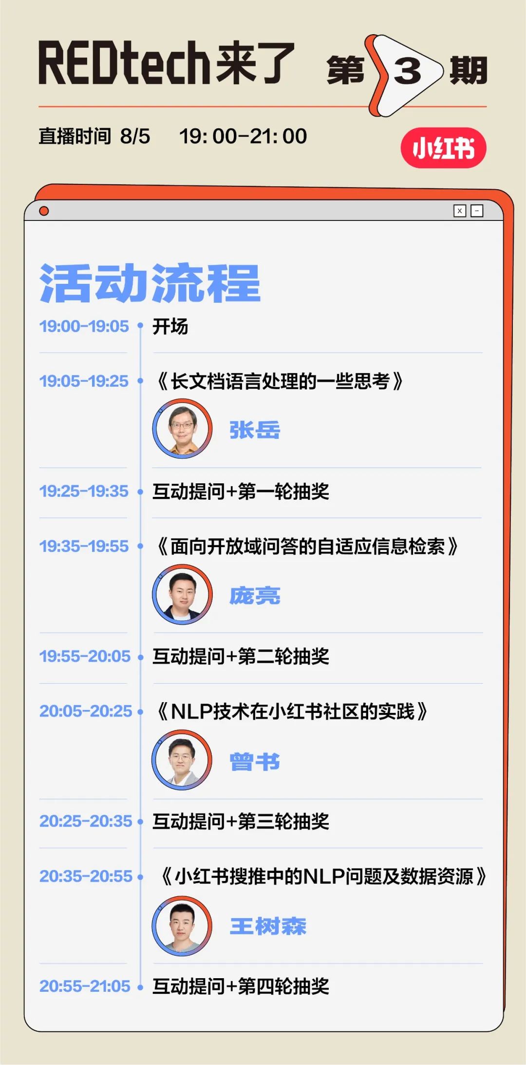 直播平台:关注【小红书技术 REDtech 】视频号,预约直播,不见不散。(直播也将在抖音与B站同步进行,搜索“小红书技术 REDtech ”)