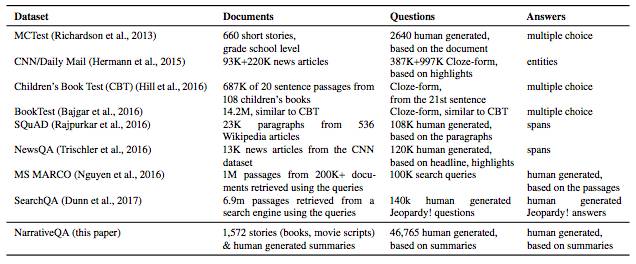 在NarrativeQA之前,也有很多用于训练阅读理解模型的数据集,例如MCTest、CNN/Daliy Mail、CBT、BookTest、SQuAD、NewsQA、MS MARCO以及SearchQA等。下表就展示了这几种数据集的基本情况和主要特点。