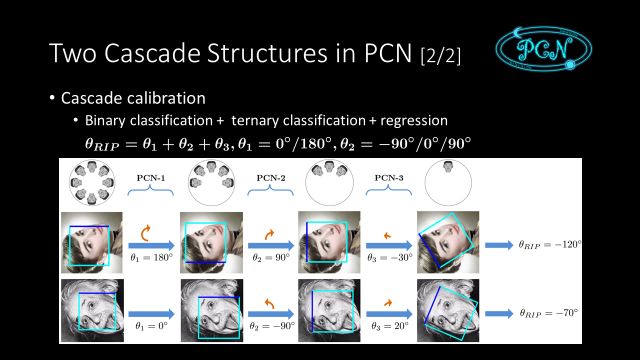 第二个级联结构是旋转角度的级联校准。PCN的级联校准属于一种由粗到精的级联回归模式,与人脸特征点估计、人体姿态估计思想类似。人脸的旋转角度等于三级网络预测结果之和。