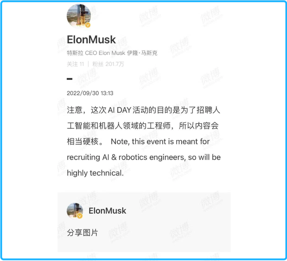 AI Day前一天,马斯克在社交媒体上称:这次AI DAY活动的目的是为了招聘人工智能和机器人领域的工程师,所以内容会相当硬核。