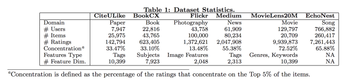 其中Concentration表示了评分集中在Top 5%物品的比例,可以反映该数据集对于热门物品的偏爱程度,与用户个性化物品偏爱程度。