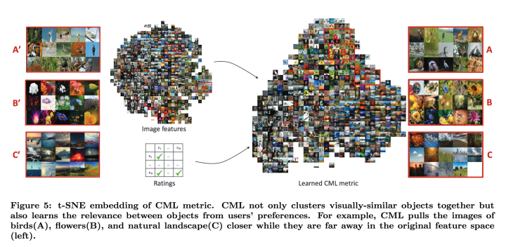 选取了图像集来说明CML在只关注与user-item关系的情况下对item-item的similarity也产生了很好的效果。