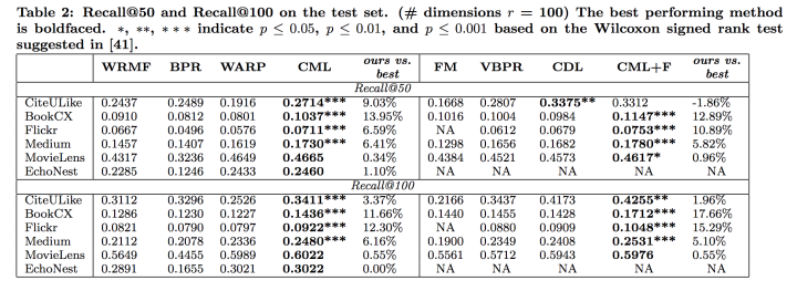 并且CML方法在对于注重用户兴趣的数据集上比较好,说明CML能很好的发现用户的preference。