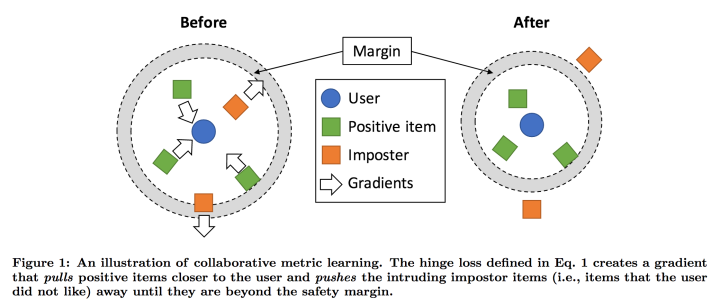均相似,而度量学习的策略即缩短相似数据对之间的长度,而同时度量满足三角不等式,所以学习过程就会自动将相近的样本的距离缩短,这种类似于相似度传播的结果与CF的思想有点像,于是作者想到将metric learning与CF结合起来解决用户用品推荐的问题。提出了CML(Collaborative Metric Learning)的模型。