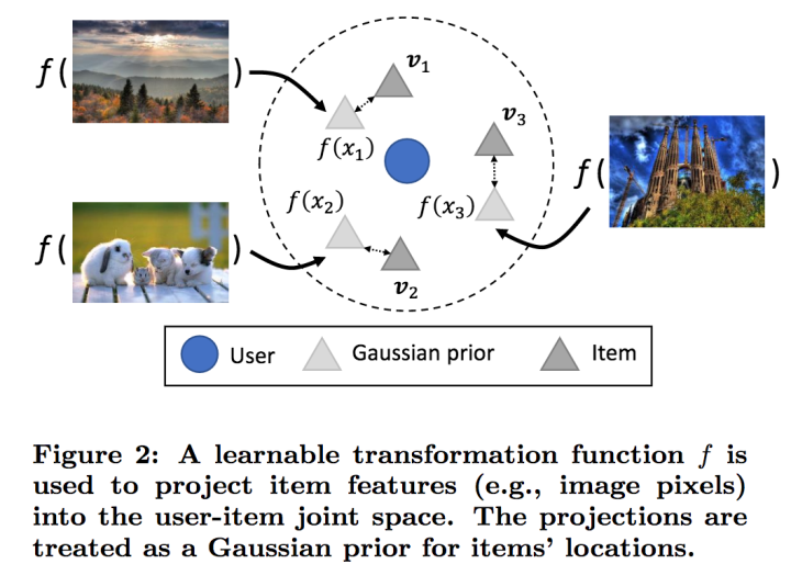 里面是user-item的数据对,并且是已知具有正相关的,通过学习user-item之间度量来将这种关系编码到第三方空间,具体的学习,拉近