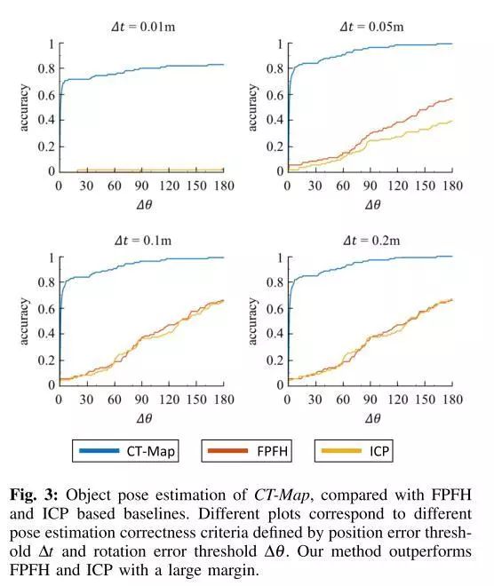 图3.与基于FPTH和ICP的基线比较的CT-Map的目标姿态估计。不同的图对应于由位置误差阈值∆t和旋转误差阈值∆θ定义的不同姿态估计正确性标准。我们的方法比FPTH和ICP有很大的优势。