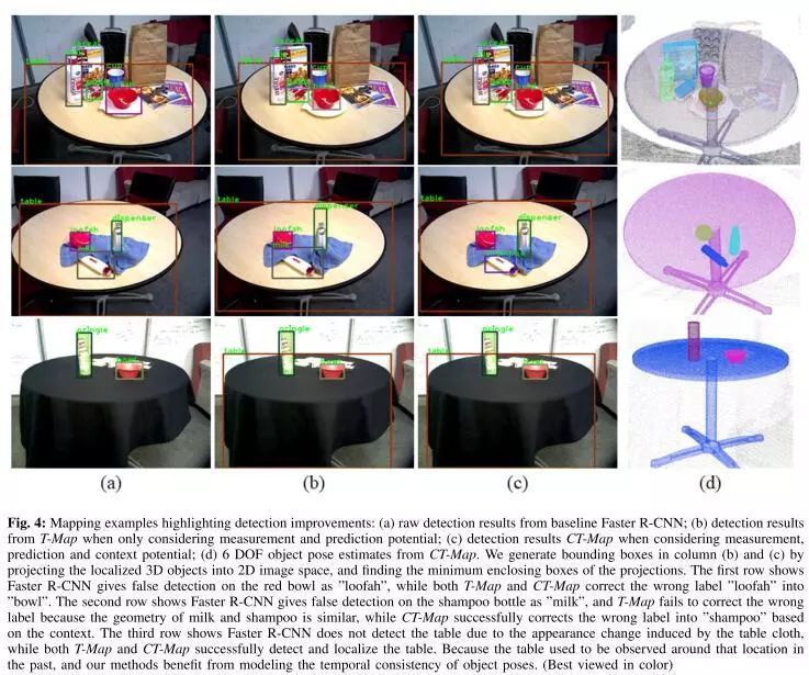 图3.高亮表示检测改进的绘图示例:(a)基线方法Faster R-CNN的原始检测结果;(b)仅考虑测量和预测可能性时T-MAP的检测结果;(c)考虑测量、预测和上下文可能性时的CT-Map检测结果;(d)CT-Map的6自由度目标姿态估计。我们在(b)和(c)列中生成边界框,方法是将本地化的三维对象投影到二维图像空间中,并找到投影的最小边界框。第一行显示 Fater R-CNN在红碗上以“loofah”的形式进行错误检测,而T-MAP和CT MAP都将错误的标签“loofah”更正为“bowel”。第二行显示 Faster R-CNN在洗发水瓶上以“milk”的形式进行错误检测,而T-MAP由于牛奶和洗发水的几何结构相似而未能更正错误的标签,而CT-MAP则根据上下文成功地将错误的标签更正为“shampoo”。第三行显示 Faster R-CNN由于桌布引起的外观变化而无法快速检测到桌子,而T-MAP和CT-MAP都成功地检测和定位了桌子。因为在过去我们经常在这个位置周围观察这个桌子,我们的方法从建模对象姿态的时间一致性中受益。