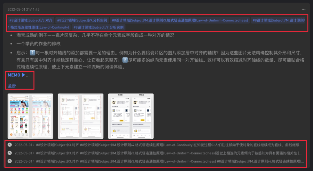 原子化思维就是一张卡片只有一个知识点,不能把多个知识点混在一张卡片里,否则以后做卡片关联的时候我们不能一下子对应到是哪一个具体的知识点。举一个例子,在设计知识的学习过程中,我会首先提取大致的知识框架,比如:色彩、图标、对齐、文字、阴影、设计原则、分析实例。这样,我就可以把「理论规律」和「分析实例」切分开来。在学习新知时,我就会去不断进行回顾:这是一条新的理论吗?或者,这个实例对应了什么设计原则,蕴含了什么色彩知识呢?