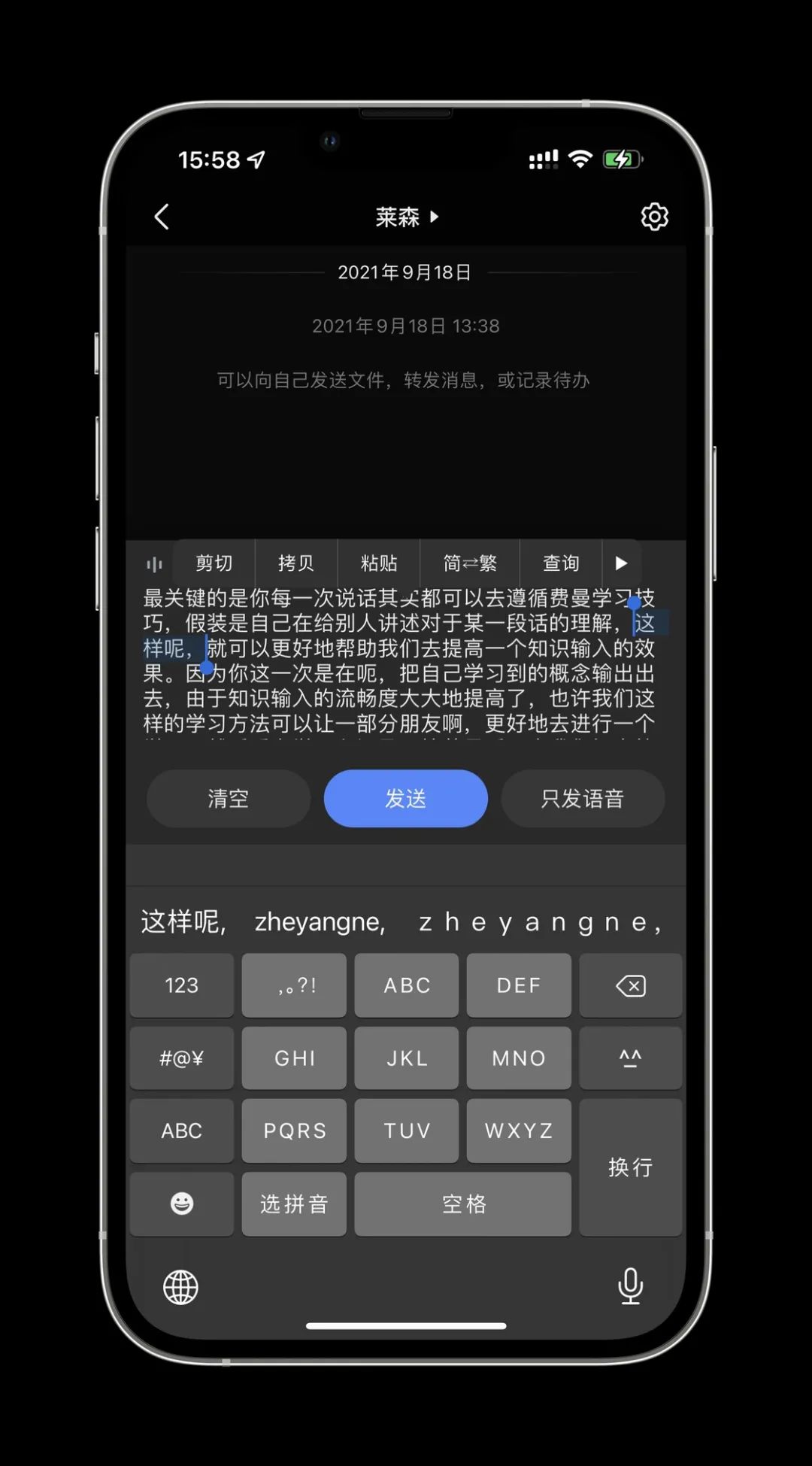 最关键的是,你每一次说话其实都可以去遵循「费曼学习技巧」。假装在给别人讲述自己对于某一段话的理解,这样可以更好地提高知识输入的效果。由于知识输入的流畅感大大提高,也许它可以让你更加热爱「用自己的话解释新知」。接着复制文字,用 AssistiveTouch 打开「Send to Flomo」快捷指令,粘贴并选择标签对知识进行串联和管理,方便你事后进行更好地回顾。