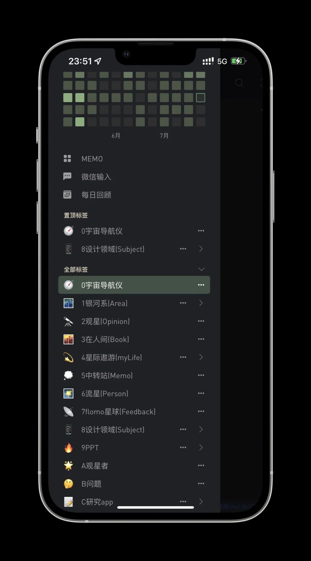 我在 Flomo 101(即 Flomo 官方说明文档)里跟随创始人少楠的视角接触到了用标签管理知识卡片的方法。于是我很快又带着热情创建了一个特别的标签系统(如图)。在接下来的一个月,我常常在大学寝室和教室往返的路途以及洗澡之后记录灵感。