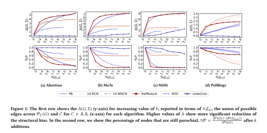 摘要:表达不同观点的页面之间的超链接图的拓扑结构可能会影响读者对各种内容的理解。结构性偏见可能会使读者陷入两极分化的泡沫中,而无法获得其他意见。我们将读者的行为建模为随机游走。如果从节点到另一观点的页面的随机游走的预期长度很大,则该节点处于极化泡沫中。图的结构偏差是高度极化的气泡半径的总和。我们研究了通过边插入来减少结构偏差的问题。在对数因子内很难治愈所有具有高极化气泡半径的节点,因此,我们着重于寻找插入的最佳 k 边以最大程度地减少结构偏差。我们介绍了RePBubLik,这是一种利用随机游走接近中心性的变体来选择要插入的边的算法。RePBubLik在温和条件下获得恒定因子近似值。它比现有的边推荐方法(包括一些旨在减少图极化的方法)更快地降低了结构偏差。