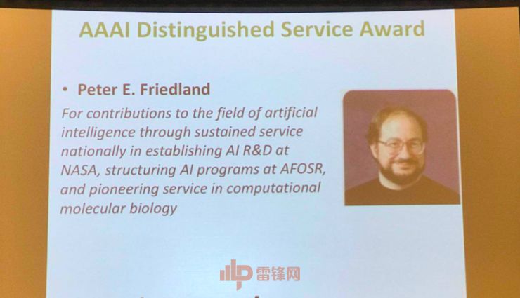 每年的杰出服务奖授予一位对 AI 社群作出突出贡献和服务的个人。今年,这一奖项颁给了 Peter Friedland,他曾在 NASA 建立 AI 研究部门、在美国空军科学研究局部署人工智能相关计划,以及在计算分子生物学取得了相关成就。