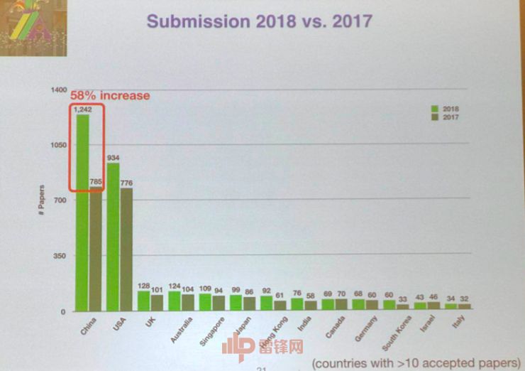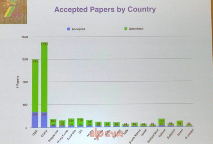 但从录用论文的数量来说,中美两国仍然不相上下,均有 260 余篇论文被收录,可见来自中国的投稿数虽然有了大幅提升,但在质量上仍然有进步的空间。