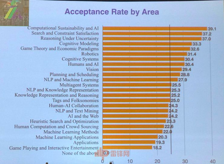AAAI 2017 在博弈论领域的论文录取率最高,达到 0.38,而 NLP 领域的录取率相对较低,只有 0.21;而今年看来,「计算持续性与 AI」、「搜索及约束满足」、「不确定性推理」等领域的录用率相对较高,达到 0.37 以上;而去年录用率较低的 NLP 领域,录用率则有了相对的提升。