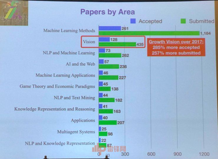 今年,机器学习方法占据投递论文数量和录用数量的宝座(投稿 1184 篇,收录 261 篇);而值得一提的是,AAAI 2018 在视觉领域(Vision)的投稿数和论文录用数实现了质的飞跃,以 257% 的投稿增长和 285% 的录用增长比重排在第二名。NLP 及机器学习、AI 和网络、机器学习应用等相关研究领域紧随其后。