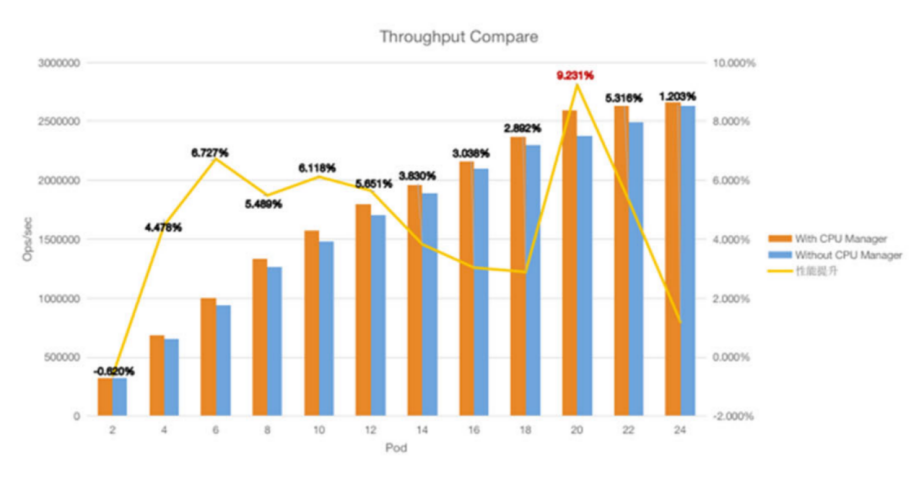 另外值得一提的是,CPU Manager 给 KubeSphere 企业版带来的性能提升表现十分亮眼。当我们测试部署不同的 Redis pod 会发现,开启 CPU Manager 后的 Redis 的读写性能与开启前的读写性能相比,Redis 性能最高可以提升超过 9%。