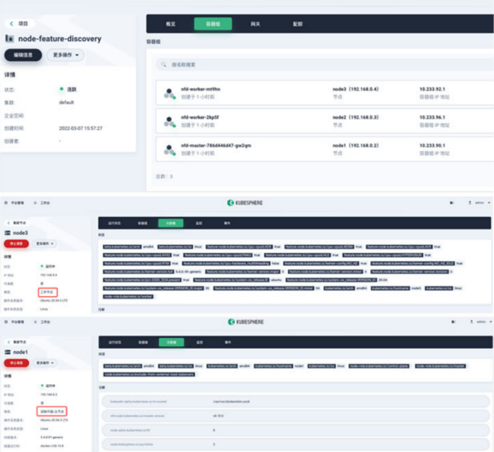 此外,为了检测 Kubernetes Cluster 中每个 Node 的特性能力,英特尔还开发了 NFD(Node Feature Discovery),而 KubeSphere 企业版深度集成了 NFD,使其节点管理得到增强。KubeSphere 企业版通过把节点更详细的 Label 发送到 KubeSphere 企业版 Master Scheduler 之上,应用负载获得了更精准的调度,使其更充分地利用硬件资源。
