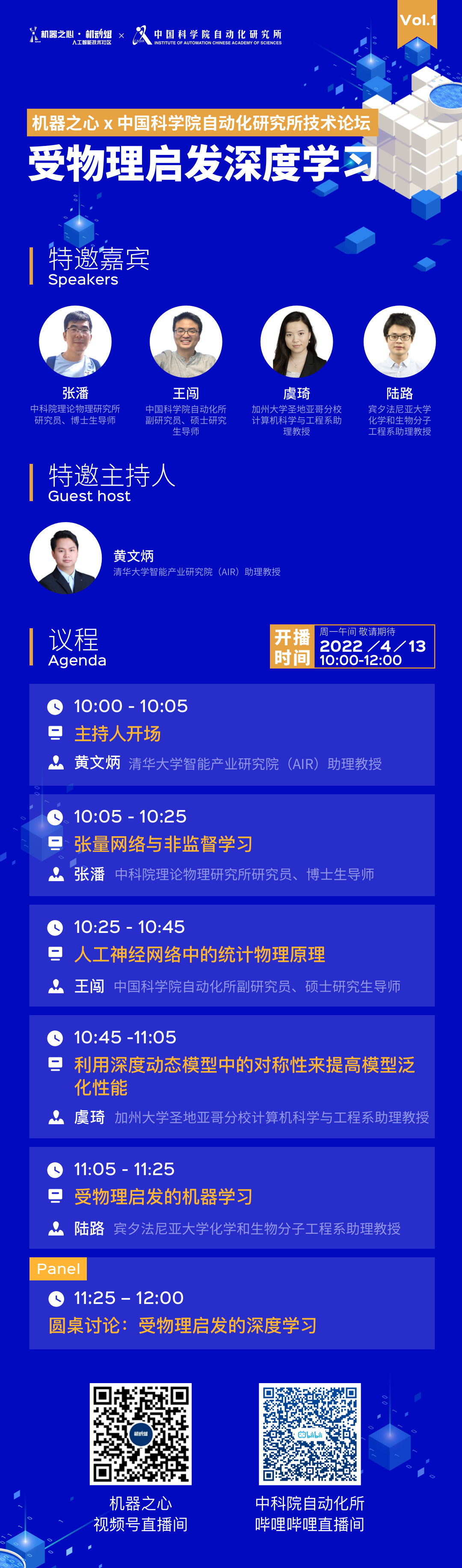 4月13日10:00 - 12:00,「机器之心 x 中科院自动化所技术论坛」第一期在线上举办,以「受物理启发的深度学习」为主题,特邀清华大学智能产业研究院(AIR)助理教授黄文炳主持,多位领域专家做技术分享,聚焦受物理启发的深度学习,核心受众为机器学习领域硕博研究生。