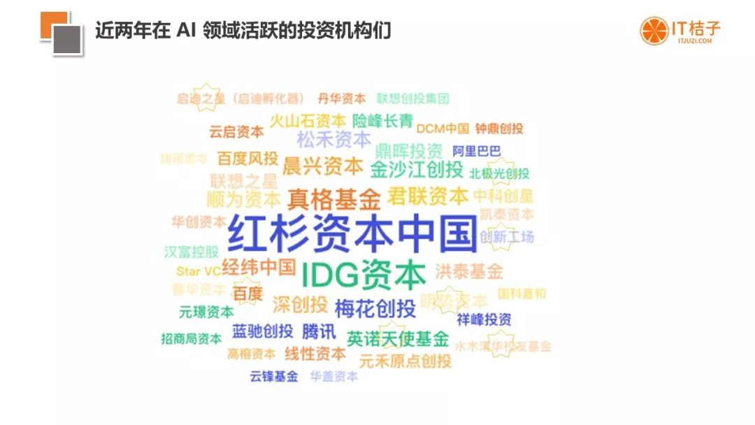 近两年在 AI 投资领域最活跃的投资方,从数量上看综合类的大型基金红杉中国、IDG 的覆盖量绝对是大头,尤其这两家 VC 在近两年开始进行投资阶段的扩张,向早期的布局也越来越多。其他大比例投资 AI 领域的机构还有启迪之星、北极光、创新工场、明势资本、百度资本、水木清华校友基金、英诺天使等。