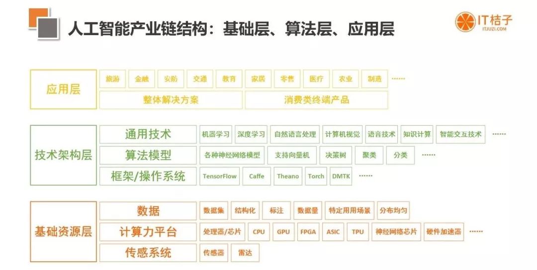在人工智能的产业链图谱里,我们把目前的 AI 产业划分为基础资源层、技术架构层和应用层。