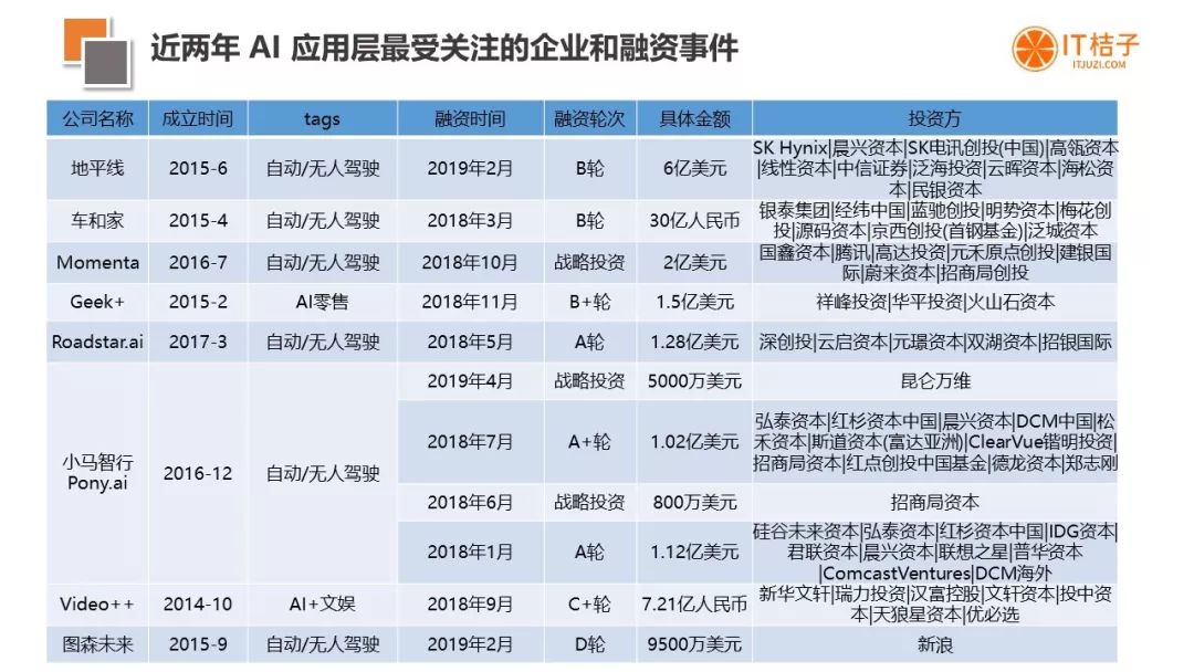 在 AI 应用层面的交易,首先从金额上看,由于无人驾驶处在「新能源造车+人工智能」这两个热门领域的交叉点,上榜企业多数为无人驾驶技术相关。