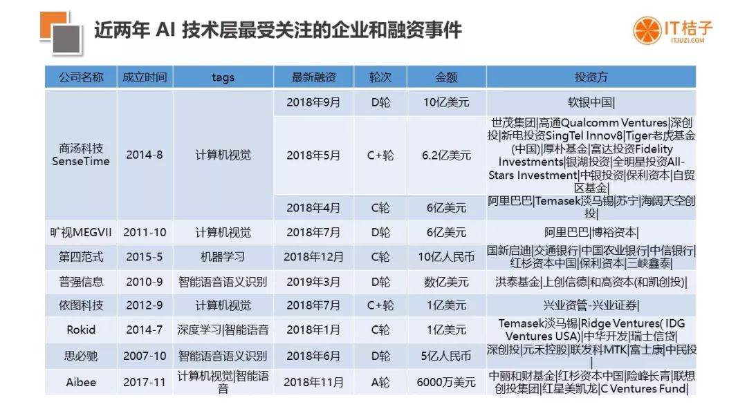 在 AI 技术层,计算机视觉和语音语义的投资成为最大竞争场,近两年基本成了头部明星企业的资金竞赛,绝大部分都被推到了 C、D 轮。这个层面的投资方类型丰富,包括互联网巨头 BAT、头部 VC,还有产业玩家。