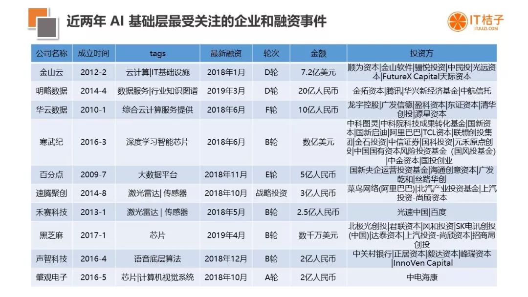 我们把近两年里,AI 产业链上的三个层面上分别最受关注的投资事件和对应企业拿出来看: