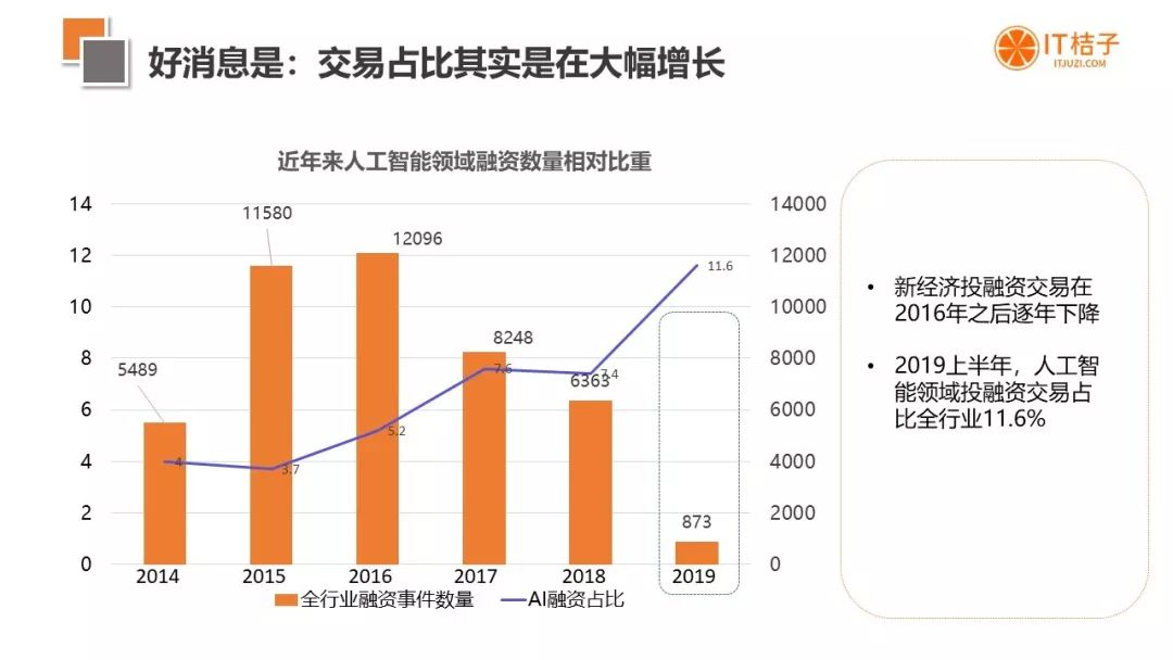 2019 上半年 AI 领域的交易量占全行业的比重达到 11.6%。