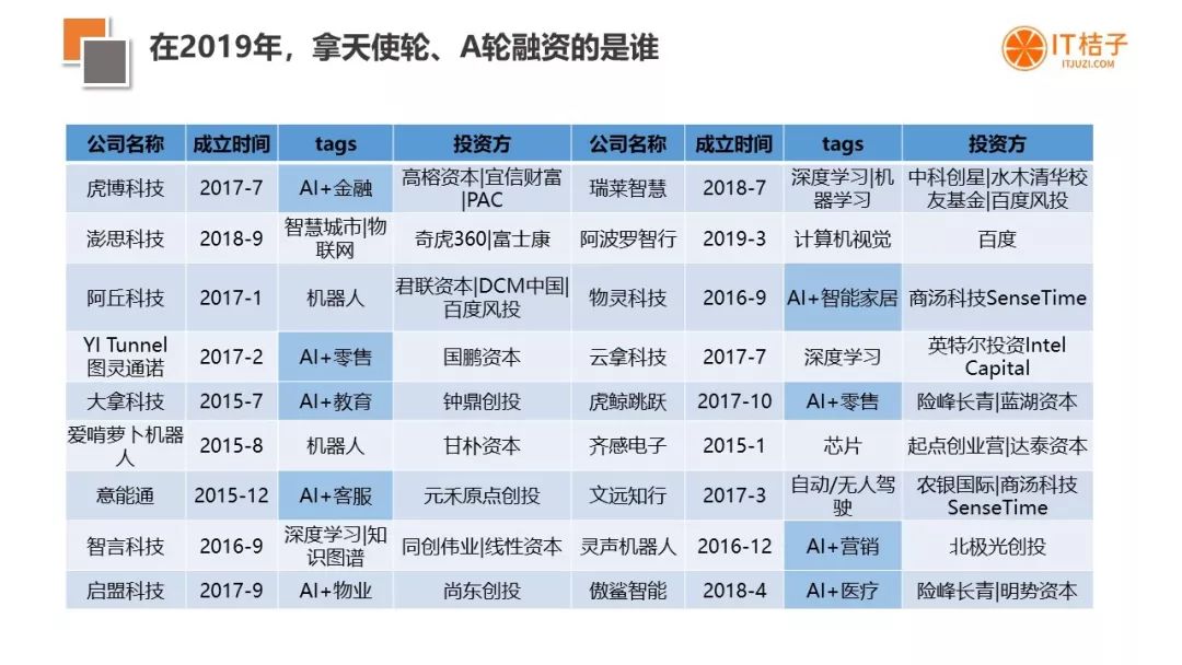 马太效应如此残酷,初创企业的出路在哪里呢?观察 2019 年融资的天使轮、A 轮项目,大部分都在尝试「AI+应用场景」的探索,包括在零售、客服、金融、营销、教育、医疗等等领域。天使投资机构们也表现出了对 AI 初创企业的热情支持。