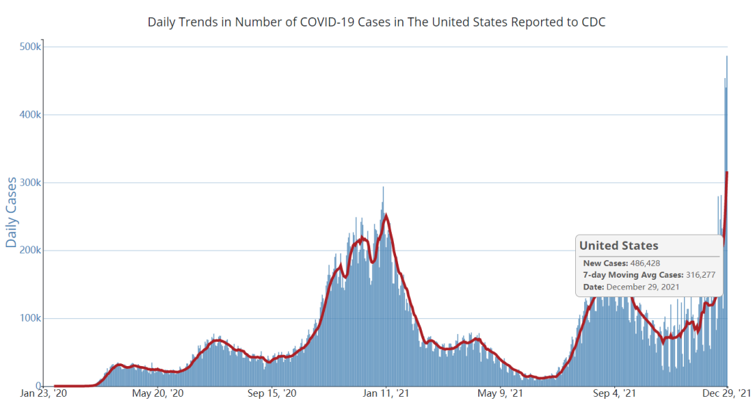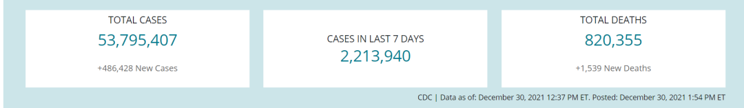 以美国为例,根据CDC的统计数据显示,几天前的12月29日,美国全国每日新增新冠病例数量已经直逼50万,一日新增486428例,新增死亡病例1539例。近7日新增病例超过221万例。