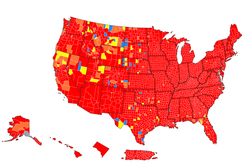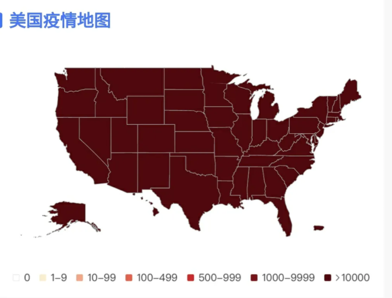 而在反映疫情严重程度的地图上,除了加州和中西部少数几个州之外,美国全国已是一片红色。