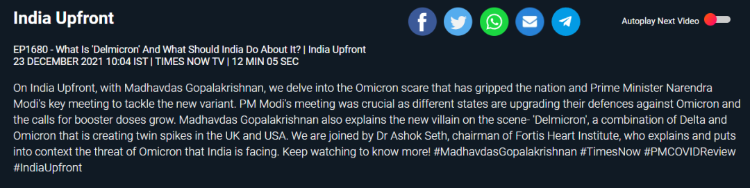印度媒体Times Now TV邀请Fortis心脏研究所主席阿绍克·塞斯(Ashok Seth)博士对「Delmicron」进行了解读。后者认为,这个说法在科学上缺乏依据。