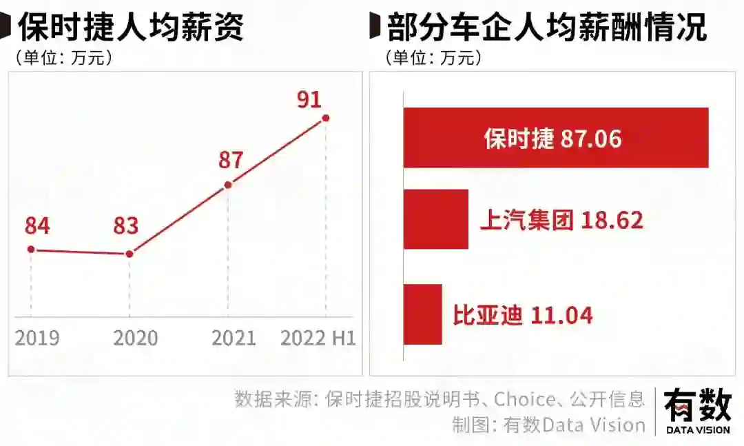 近三年,保时捷的人均薪资连续增长,目前已经超过了90万元,是比亚迪的八倍。