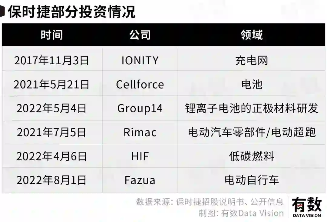 除了人才和研发上的投入之外,保时捷也有积极入局电动化产业上的公司。比如,早在2017年,保时捷就已经投资了与充电网相关的IONITY;并且在最近几年,在投资频率上更加频繁,在投资的领域上,覆盖也更加全面。