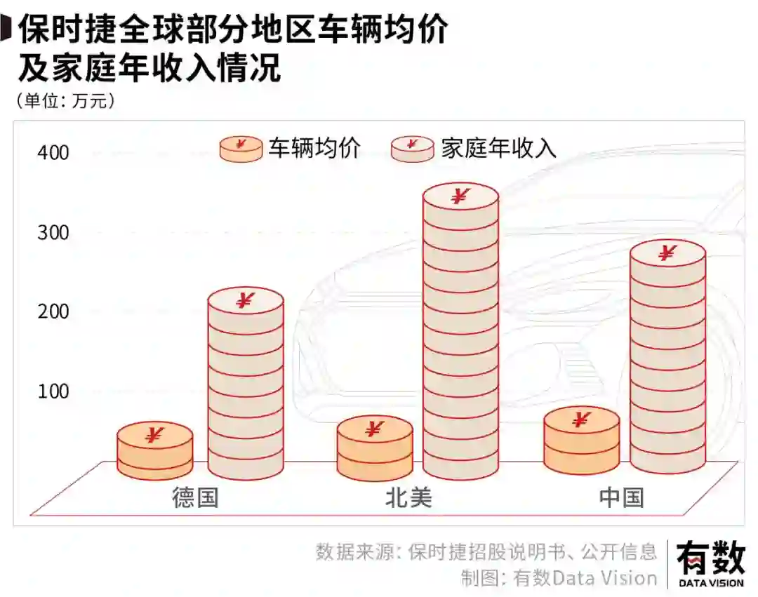 保时捷在招股书中做了一个有趣的统计:车辆均价和车主家庭年收入的关系。至于为什么中国市场的家庭年收入比德国还高,我们也不知道,我们也不敢问。