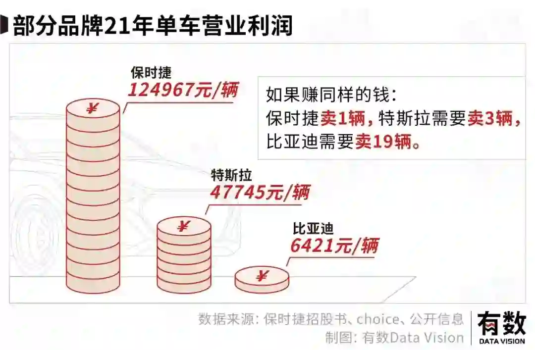 如果按相同口径衡量盈利能力,保时捷卖一辆,特斯拉需要卖三辆,比亚迪需要卖19辆。