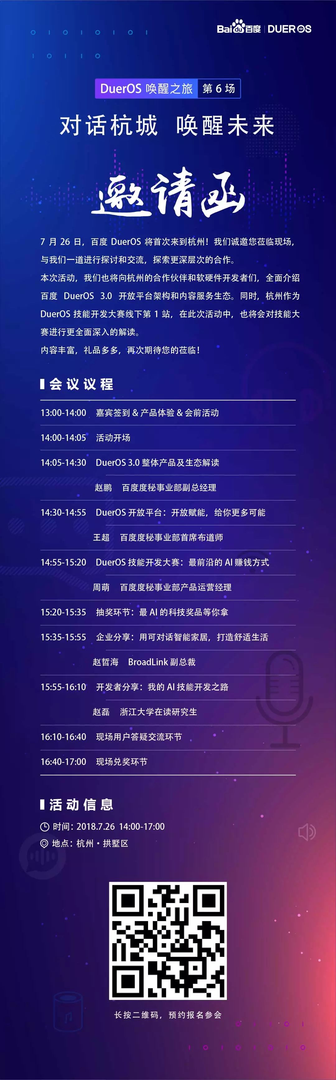由百度 DuerOS 发起的「唤醒之旅」系列沙龙第 6 场,将于 7 月 26 日来到杭州。