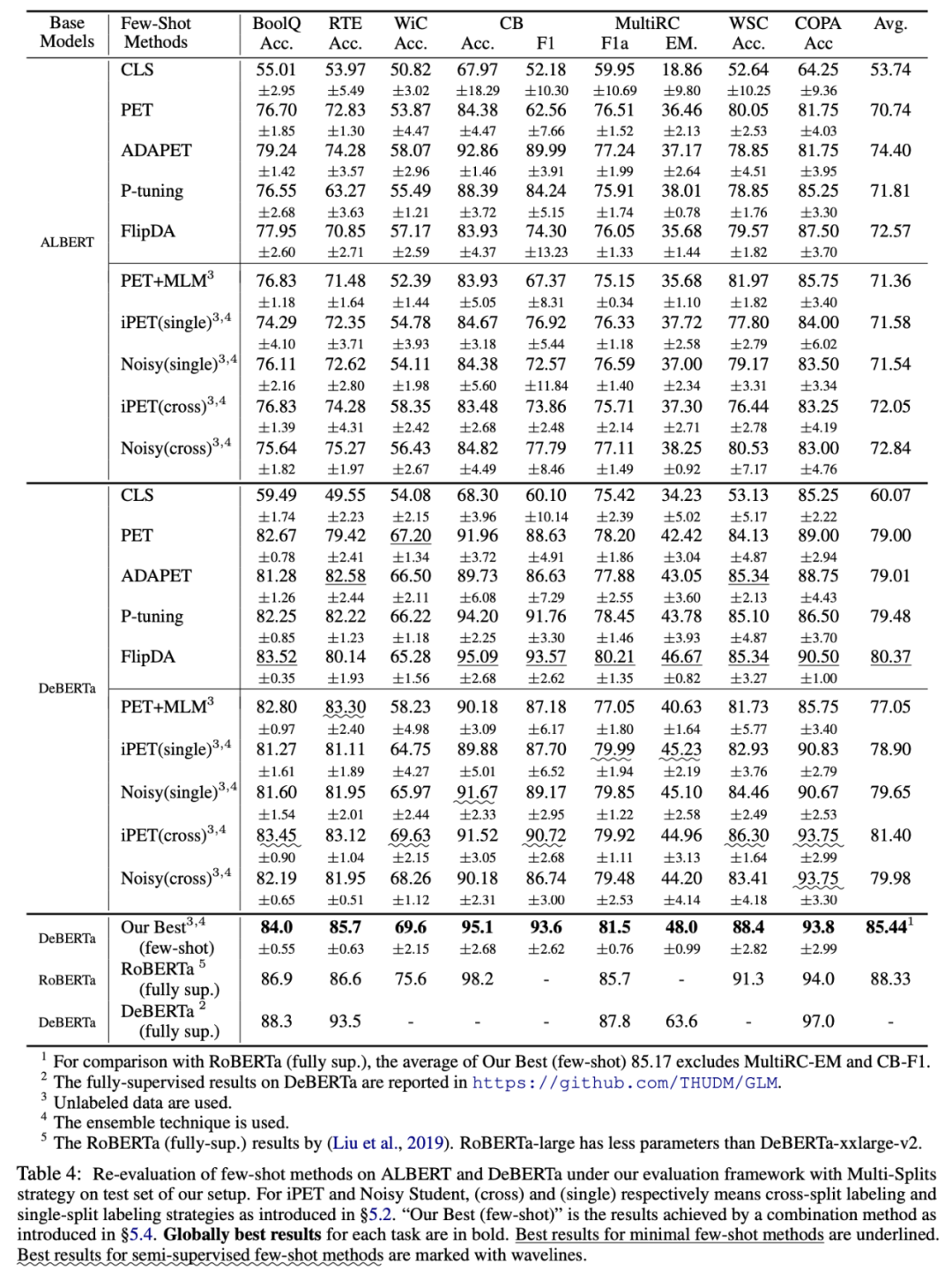 结论 1: 小样本学习方法的绝对性能和相对性能差异,在先前文献中未被准确估计。此外小样本方法(例如 ADAPET)在像 DeBERTa 这样的大型模型上的优势会显著降低。半监督小样本方法(例如 iPET 和 Noisy Student)增益在较大的模型也可以保持一致性。