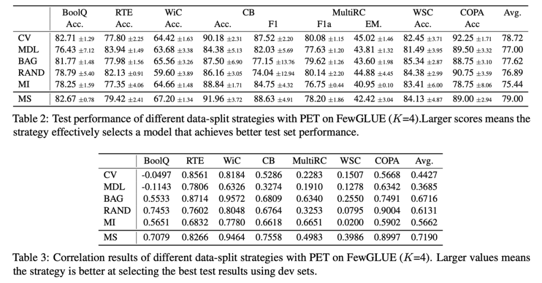 基于此,本文对多种不同的数据拆分策略进行了量化实验和讨论,包括 (1) K 折交叉验证 (K-Fold CV)[2], (2) 最短描述距离(MDL)[2],(3) Bagging [9], (4) 随机采样策略 (5) 模型指导的拆分策略 (6) 以及本文提出的多次数据划分(Multi-Splits)。