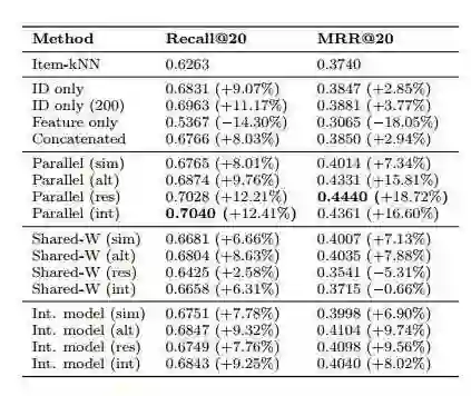 Parallel 并行更新 item ID 和 feature 的模型达到最好的效果,Parallel shared-W 和 Parallel interaction 交互模型并没有好的效果,可能原因重复的序列信息加重了模型的训练负担。
