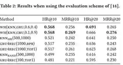 本文的贡献在于提出将 session 中的 RNN 模型,与 KNN 方法结合起来,能够提高推荐的效果。