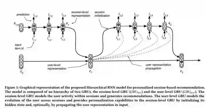 用两个 GRU,Session-level GRU 和 User-level 的 GRU 分别刻画 session 信息和 user历史信息,模型架构图如下,对于一个用户的多个 sessions,当一个 session 结束时,用该 session 的输出作为当前的 user 的表示,并用来初始化下一个 session 的输入。